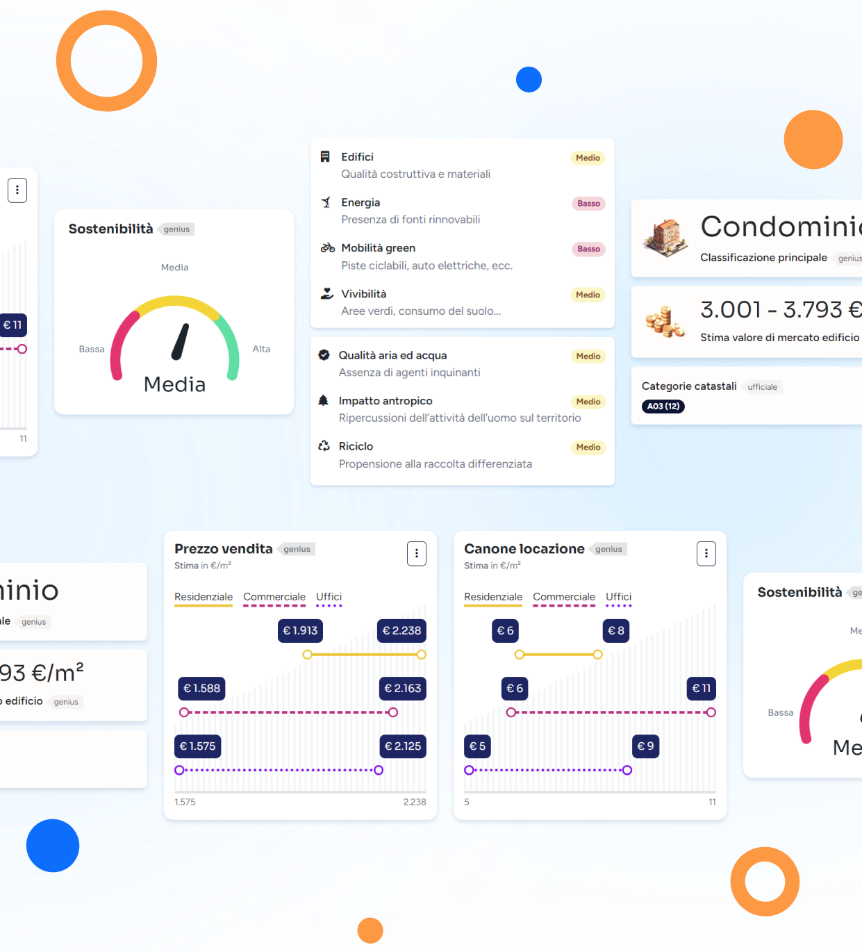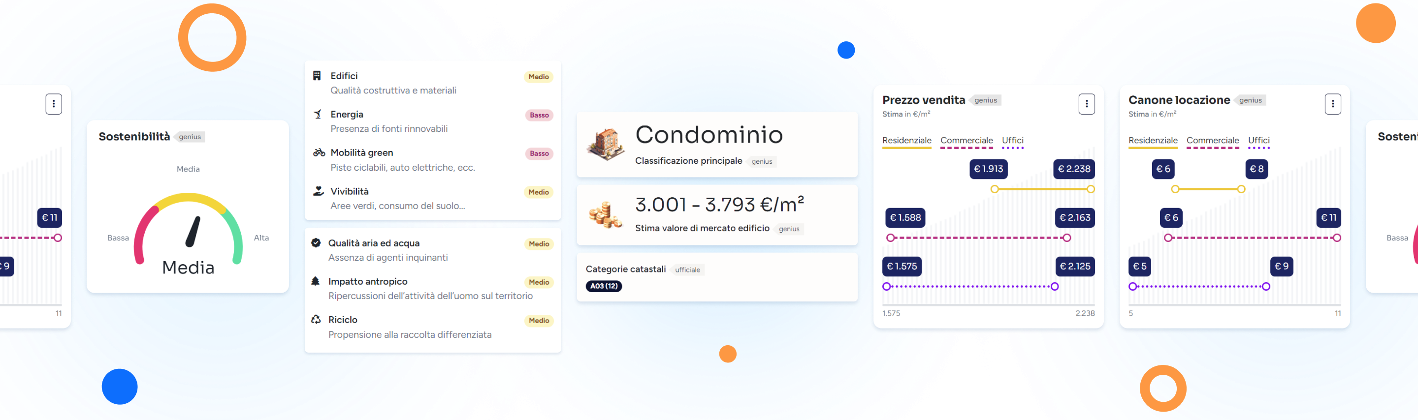 Attraverso l’incrocio di elaborazioni Genius Loci, in aggiunta ai dati ufficiali e open, Genius Property ti restituisce il valore attuale di ogni immobile.