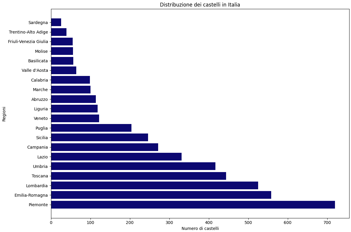 Con un numero totale di circa 4.500, questi edifici non rappresentano solo una componente fondamentale del patrimonio culturale e architettonico dell’Italia, ma sono anche un elemento chiave nell’attrazione turistica del Paese; ogni regione offre una ricchezza di castelli che raccontano storie uniche. Il grafico sottostante fornisce una chiara visione della distribuzione regionale dei castelli, mostrando come Piemonte, Emilia-Romagna e Lombardia emergano come le regioni con la più alta concentrazione di queste strutture storiche.