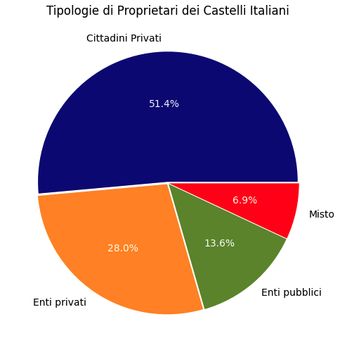 Come mostra il grafico a torta  la maggior parte dei castelli è di proprietà di cittadini privati, seguono poi gli enti privati, e infine gli enti pubblici, ma una porzione di questo patrimonio rimane condiviso tra cittadini, enti pubblici e privati. Questo dimostra la diversità di interessi e funzioni che questi edifici storici rivestono oggi.