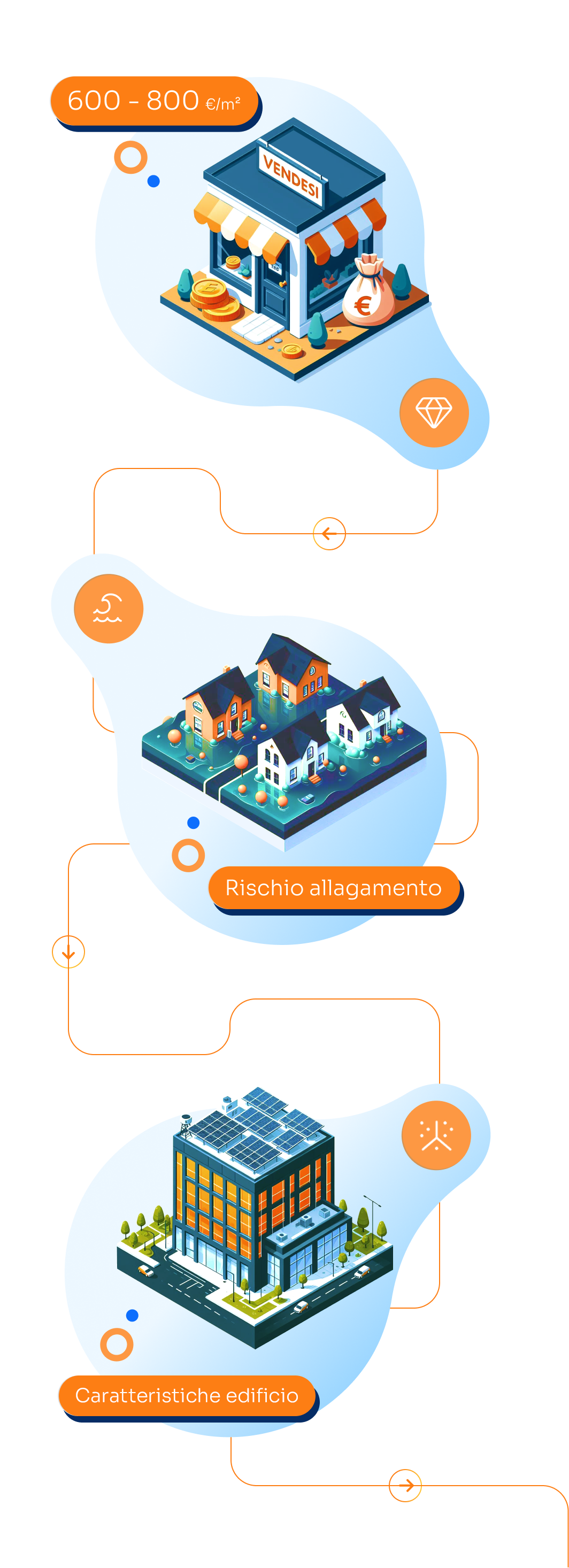 l'immagine in alto mostra un piccolo negozio con l'insegna "In vendita" e una fascia di prezzo di 600-800€/m²