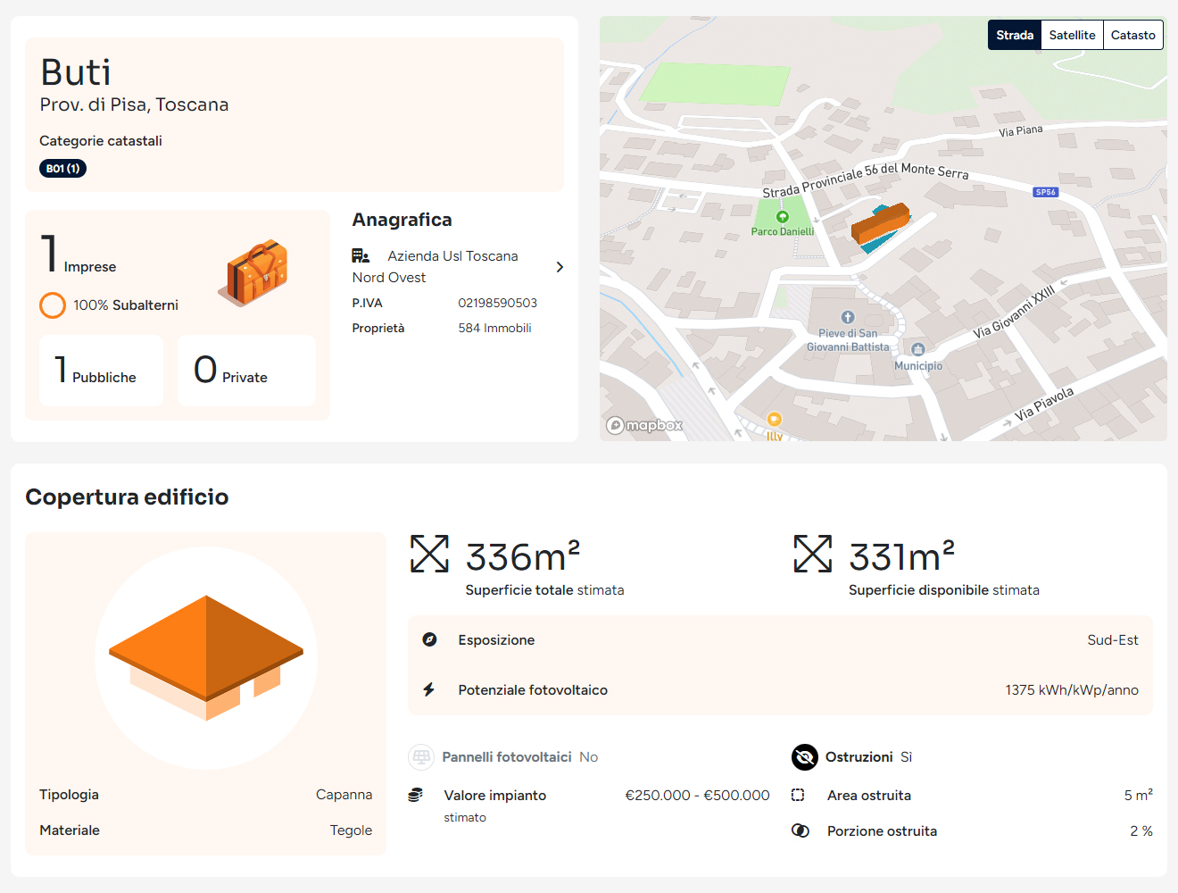Trova subito i comuni più interessanti per nuovi progetti, sia a terra che su tetto. I dati geospaziali e le stime energetiche facilitano il pre-screening delle aree. Risparmia tempo nella fase di scouting e aumenta l’efficienza progettuale.