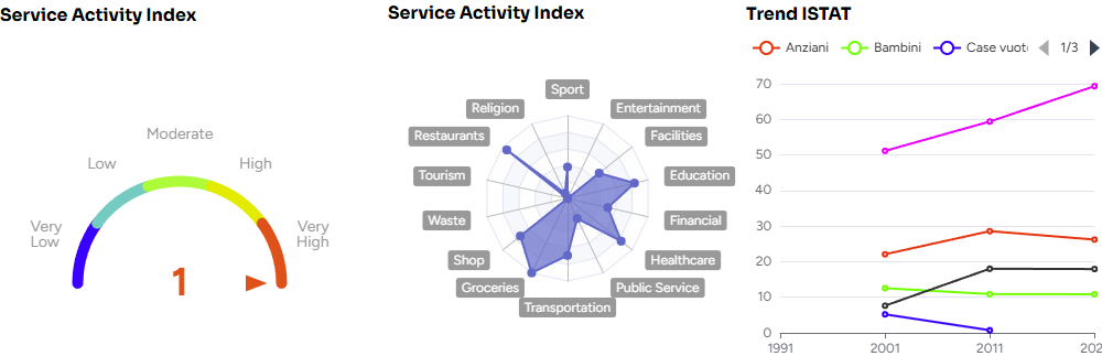 L’analisi si arricchisce anche di una componente temporale. Grazie ai dati ISTAT è possibile leggere i cambiamenti nella popolazione locale: quanti bambini? Quanti anziani? Quante abitazioni vuote?
